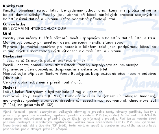 | Farmako-terapeutická skupina, účinné látky: | RESPIRAČNÍ SYSTÉM -> KRČNÍ LÉČIVA -> KRČNÍ LÉČIVA -> JINÁ KRČNÍ LÉČIVA -> BENZYDAMIN |