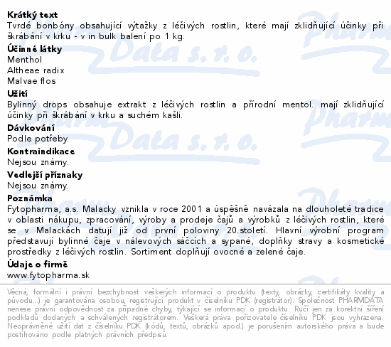 Tvrdé bonbóny obsahující výtažky z léčivých rostlin, které mají zklidňující účinky při škrábání v krku - v in bulk balení po 1 kg.