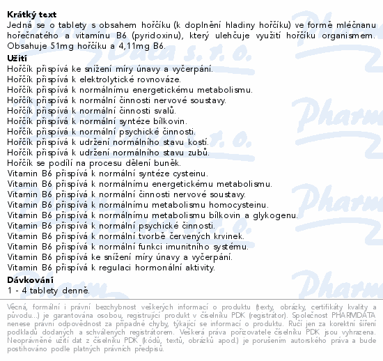 Jedná se o tablety s obsahem hořčíku (k doplnění hladiny hořčíku) ve formě mléčnanu hořečnatého a vitamínu B6 (pyridoxinu), který ulehčuje využití hořčíku organismem. Obsahuje 51mg hořčíku a 4,11mg B6.