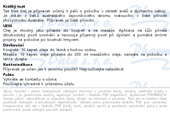 Tea tree olej je přípravek určený k péči o pokožku v oblasti svalů a dýchacího ústrojí. Je získán z lístků australského čajovníkového stromu rostoucího v čisté přírodě jihovýchodní Austrálie. Přípravek je čistě přírodní.