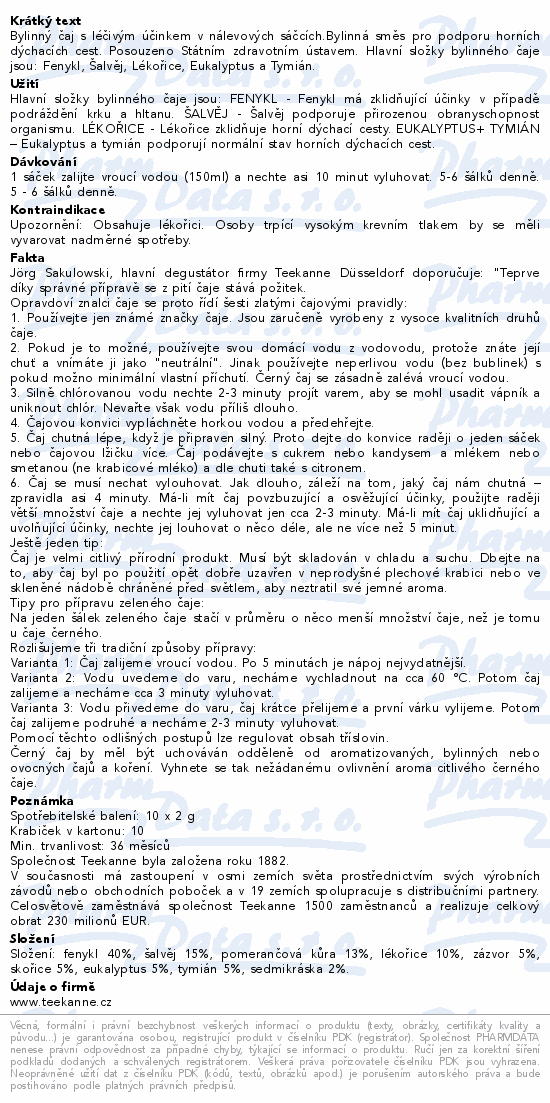 Bylinný čaj s léčivým účinkem v nálevových sáčcích.Bylinná směs pro podporu horních dýchacích cest. Posouzeno Státním zdravotním ústavem. Hlavní složky bylinného čaje jsou: Fenykl, Šalvěj, Lékořice, Eukalyptus a Tymián.