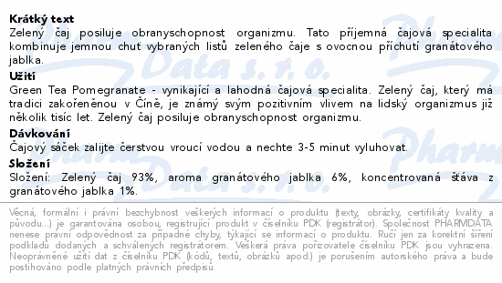 Zelený čaj posiluje obranyschopnost organizmu. Tato příjemná čajová specialita kombinuje jemnou chuť vybraných listů zeleného čaje s ovocnou příchutí granátového jablka.