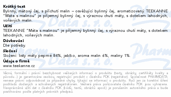 Bylinný, mátový čaj, s příchutí malin – osvěžující bylinný čaj, aromatizovaný. TEEKANNE “Máta s malinou” je příjemný bylinný čaj, s výraznou chutí máty, s dotekem lahodných, voňavých malin.