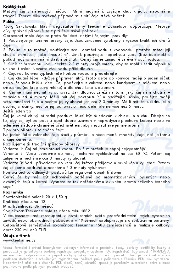 Mátový čaj v nálevových sáčcích. Mírní nadýmání, zvyšuje chuť k jídlu, napomáhá trávení. Teprve díky správné přípravě se z pití čaje stává požitek.