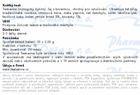 Teekanne Urologický bylinný čaj s brusinkou, vhodný pro vylučování. Obsahuje list břízy bradavičnaté, rooibos, citronová tráva, máta peprná, nať zlatobýlu, kořen lékořice lysé, fazolové lusky, kořen jehlice trnité 5%, brusinky 1%.
