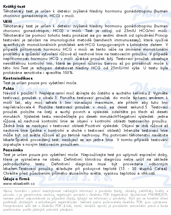 Těhotenský test je určen k detekci zvýšené hladiny hormonu gonádotropinu (human chorionic gonadotropin, HCG) v moči.