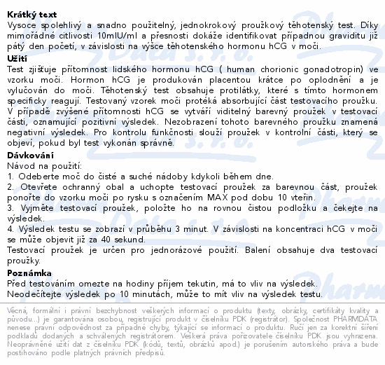 Vysoce spolehlivý a snadno použitelný, jednokrokový proužkový těhotenský test. Díky mimořádné citlivosti 10mlU/ml a přesnosti dokáže identifikovat případnou graviditu již pátý den početí, v závislosti na výšce těhotenského hormonu hCG v moči.