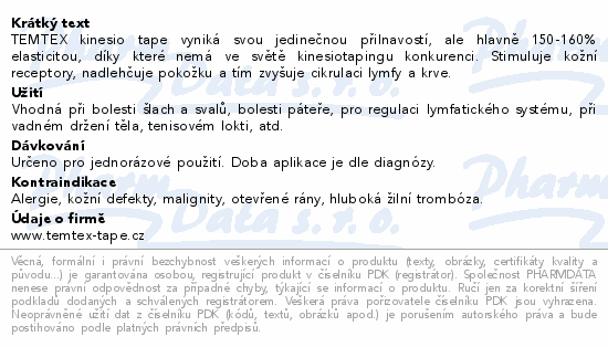 TEMTEX kinesio tape vyniká svou jedinečnou přilnavostí, ale hlavně 150-160% elasticitou, díky které nemá ve světě kinesiotapingu konkurenci. Stimuluje kožní receptory, nadlehčuje pokožku a tím zvyšuje cikrulaci lymfy a krve.