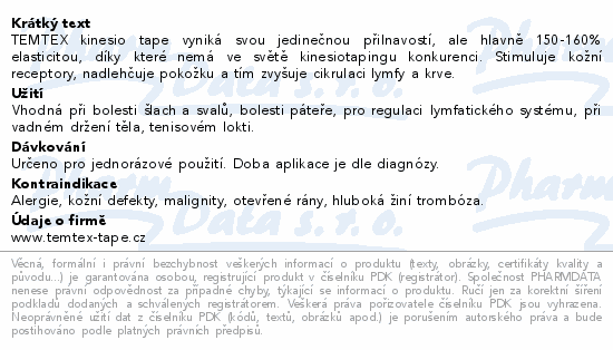 TEMTEX kinesio tape vyniká svou jedinečnou přilnavostí, ale hlavně 150-160% elasticitou, díky které nemá ve světě kinesiotapingu konkurenci. Stimuluje kožní receptory, nadlehčuje pokožku a tím zvyšuje cikrulaci lymfy a krve.