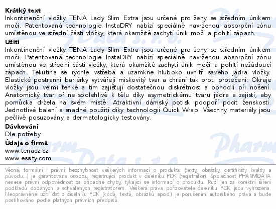 Inkontinenční vložky TENA Lady Slim Extra jsou určené pro ženy se středním únikem moči. Patentovaná technologie InstaDRY nabízí speciálně navrženou absorpční zónu umístěnou ve střední části vložky, která okamžitě zachytí únik moči a pohltí zápach.