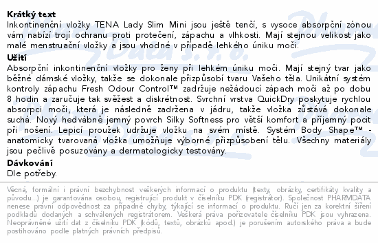 Inkontinenční vložky TENA Lady Slim Mini jsou ještě tenčí, s vysoce absorpční zónou vám nabízí trojí ochranu proti protečení, zápachu a vlhkosti. Mají stejnou velikost jako malé menstruační vložky a jsou vhodné v případě lehkého úniku moči.