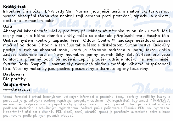 Inkontinenční vložky TENA Lady Slim Normal jsou ještě tenčí, s anatomicky tvarovanou vysoce absorpční zónou vám nabízejí trojí ochranu proti protečení, zápachu a vlhkosti, dostupné i v menším balení.