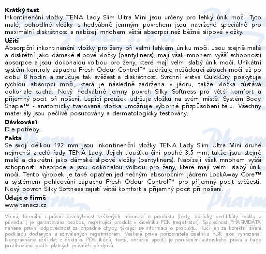 Inkontinenční vložky TENA Lady Slim Ultra Mini jsou určeny pro lehký únik moči. Tyto malé, pohodlné vložky s hedvábně jemným povrchem jsou navržené speciálně pro maximální diskrétnost a nabízejí mnohem větší absorpci než běžné slipové vložky.