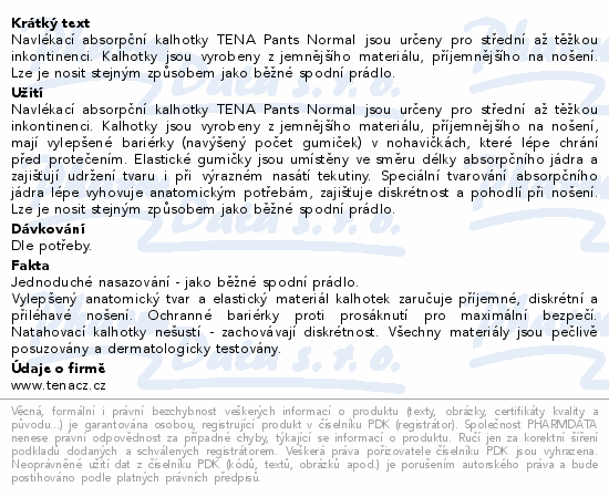 Navlékací absorpční kalhotky TENA Pants Normal jsou určeny pro střední až těžkou inkontinenci. Kalhotky jsou vyrobeny z jemnějšího materiálu, příjemnějšího na nošení. Lze je nosit stejným způsobem jako běžné spodní prádlo.