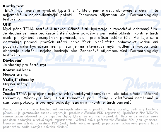 TENA mycí pěna je výrobek typu 3 v 1, který jemně čistí, obnovuje a chrání i tu nejjemnější a nejchoulostivější pokožku. Zanechává příjemnou vůni. Dermatologicky testováno.