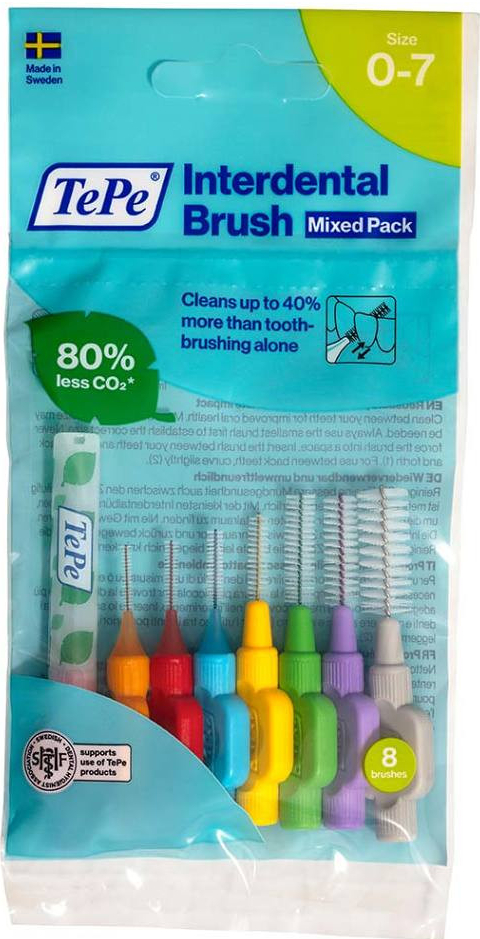 Mezizubní kartáčky mají plastem izolovaný drátek, aby byla zajištěna maximalní ochrana dásní a zubů. Speciálně vybraná vlákna zajišťují efektivní čištění. Sada 8 velikostí, 8 ks + krytka v balení, baleno v sáčku.