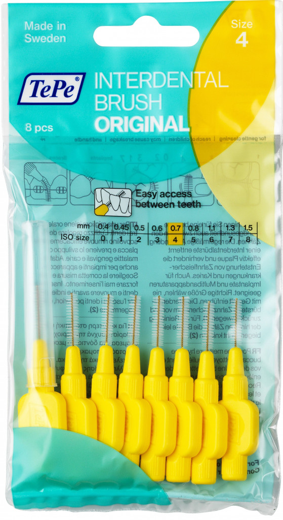 Mezizubní kartáčky TePe mají plastem izolovaný drátek, aby byla zajištěna maximální ochrana dásní a zubů. Speciálně vybraná vlákna zajišťují efektivní čištění. Průměr drátku 0,7 mm, žlutý odstín, 8 ks + krytka v balení, baleno v sáčku.