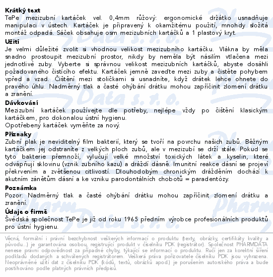 TePe mezizubní kartáček vel. 0,4mm růžový: ergonomické držátko usnadňuje manipulaci v ústech. Kartáček je připravený k okamžitému použití, mnohdy složitá montáž odpadá. Sáček obsahuje osm mezizubních kartáčků a 1 plastový kryt.
