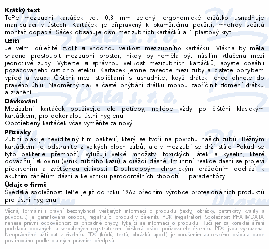 TePe mezizubní kartáček vel. 0,8 mm zelený: ergonomické držátko usnadňuje manipulaci v ústech. Kartáček je připravený k okamžitému použití, mnohdy složitá montáž odpadá. Sáček obsahuje osm mezizubních kartáčků a 1 plastový kryt.