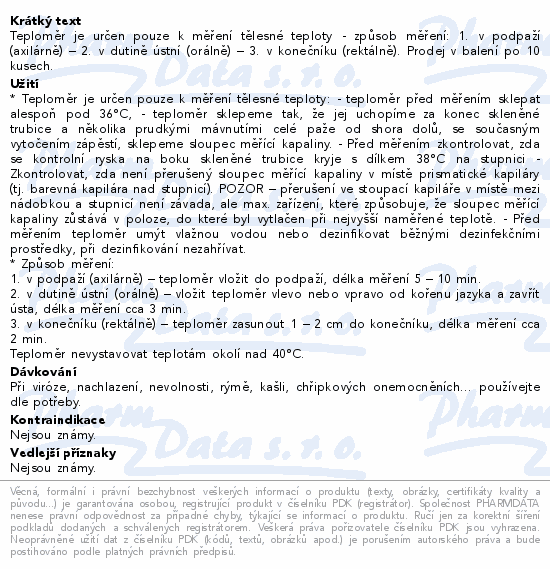 Teploměr je určen pouze k měření tělesné teploty - způsob měření: 1. v podpaží (axilárně) – 2. v dutině ústní (orálně) – 3. v konečníku (rektálně). Prodej v balení po 10 kusech.
