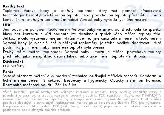 Teploměr Veroval baby je lékařský teploměr, který měří pomocí infračervené technologie bezdotykově tělesnou teplotu nebo povrchovou teplotu předmětu. Oproti konvenčním lékařským teploměrům nabízí Veroval baby výhodu rychlého měření.