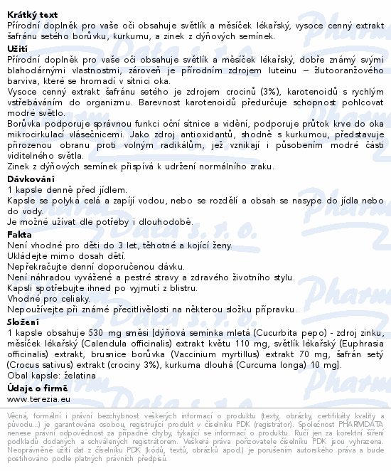 Přírodní doplněk pro vaše oči obsahuje světlík a měsíček lékařský, dobře známý svými blahodárnými vlastnostmi, zároveň je přírodním zdrojem luteinu – žlutooranžového barviva, které se hromadí v sítnici oka. Vysoce cenný extrakt šafránu setého je zdrojem crocinů (3 %), karotenoidů s rychlým vstřebáváním do organizmu. Barevnost karotenoidů předurčuje schopnost pohlcovat modré světlo. Borůvka podporuje správnou funkci oční sítnice a vidění, podporuje průtok krve do oka mikrocirkulací vlásečnicemi. Jako zdroj antioxidantů, shodně s kurkumou, představuje přirozenou obranu proti volným radikálům, jež vznikají i působením modré části viditelného světla. Zinek z dýňových semínek přispívá k udržení normálního zraku.