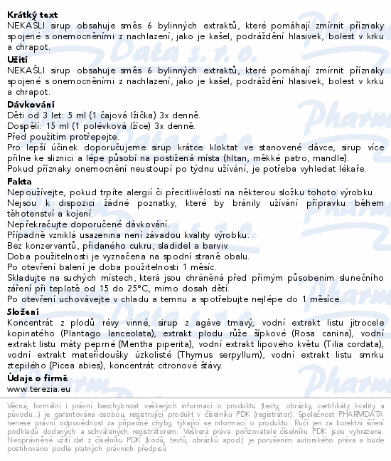 Sirup NEKAŠLI obsahuje koncentrát z plodů révy vinné, sirup z agáve tmavý, vodní extrakt listu jitrocele kopinatého (Plantago lanceolata), extrakt plodu růže šípkové (Rosa canina), vodní extrakt listu máty peprné (Mentha piperita), vodní extrakt lipového květu (Tilia cordata), vodní extrakt mateřídoušky úzkolisté (Thymus serpyllum), vodní extrakt listu smrku ztepilého (Picea abies), koncentrát citronové šťávy.