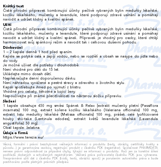 Jedna kapsle obsahuje 450 mg směsi Spánek&Relax z toho 100 mg extraktu mučenky pletní (Passiflora incarnata), 100 mg extraktu z kořene kozlíku lékařského (Valeriana officinalis), 100 mg extraktu z listu meduňky lékařské (Melissa officinalis) a 50 mg extraktu z květů levandule lékařské (Lavandula angustifolia).