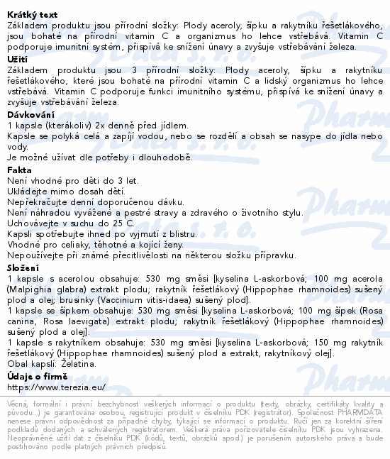 TEREZIA Vitamin C 500mg trio natur je doplněk stravy ve formě kapslí s plody aceroly, šípku a rakytníku řešetlákového, které jsou bohaté na přírodní vitamin C.