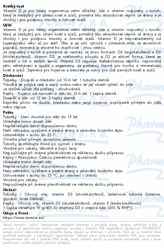 Složení Terezia Vitamin D3 400 IU: olivový olej rafinovaný, vitamin D3 (cholekalciferol), stabilizátor: směs tokoferolu.