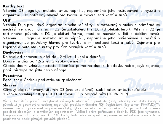 Vitamin D je pro lidský organizmus velice důležitý. Je rozpustný v tucích a primárně se nachází ve dvou formách: D2 (ergokalciferol) a D3 (cholekalciferol) jako aktivní forma nacházející se u lidí, která je tak lépe vstřebatelná. Vitamin D3 napomáhá vstřebávání a využití vápníku v organizmu. Je potřebný hlavně pro tvorbu a mineralizaci kostí a zubů. Zejména pro kojence a batolata je nezbytný pro růst pevných kostí a zubů. Vitamin D je vhodný i pro seniory a ženy v období menopauzy. Použitý olivový olej, jehož vlastnosti jsou dobře známy, zajišťuje efektivní vstřebávání vitamínu D3 do organismu.