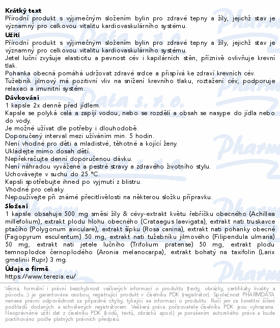 Terezia Žíly & Cévy je doplněk stravy, který obsahuje jetel luční, pohanku obecnou, tužebník jilmový, řebříček obecný, hloh obecný, truskavec ptačí, šípek a temnoplodec černoplodý.