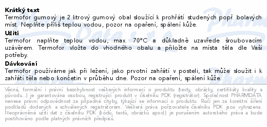 Termofor gumový je 2 litrový gumový obal sloužící k prohřátí studených popř. bolavých míst. Neplňte příliš teplou vodou, pozor na opaření, spálení kůže.