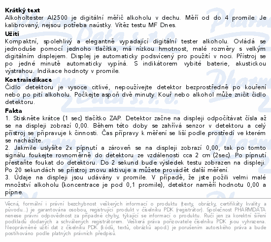Alkoholtester Al2500 je digitální měřič alkoholu v dechu. Měří od 0 do 4 promile. Je kalibrovaný, nejsou potřeba naústky. Vítěz testu MF Dnes.
