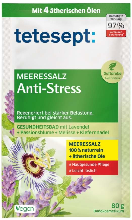 Koupelová sůl tetesept Proti stresu je speciální přísada koupele obsahující mořskou sůl a navracející rovnováhu při stresu, zátěži a napětí.