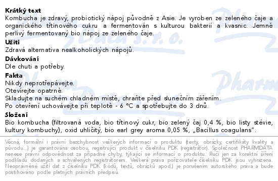 Kombucha je zdravý, probiotický nápoj původně z Asie. Je vyroben ze zeleného čaje a organického třtinového cukru a fermentován s kulturou bakterií a kvasnic. Jemně perlivý fermentovaný bio nápoj ze zeleného čaje.