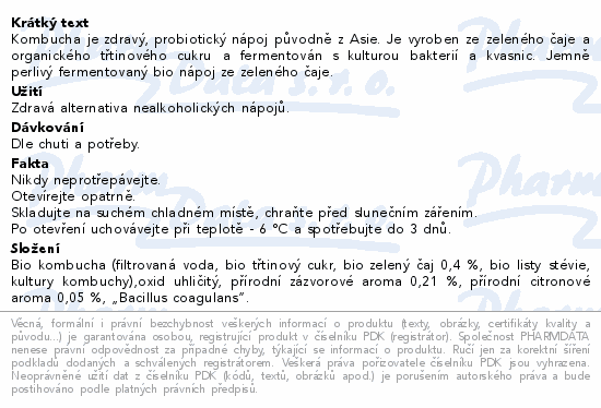 Kombucha je zdravý, probiotický nápoj původně z Asie. Je vyroben ze zeleného čaje a organického třtinového cukru a fermentován s kulturou bakterií a kvasnic. Jemně perlivý fermentovaný bio nápoj ze zeleného čaje.