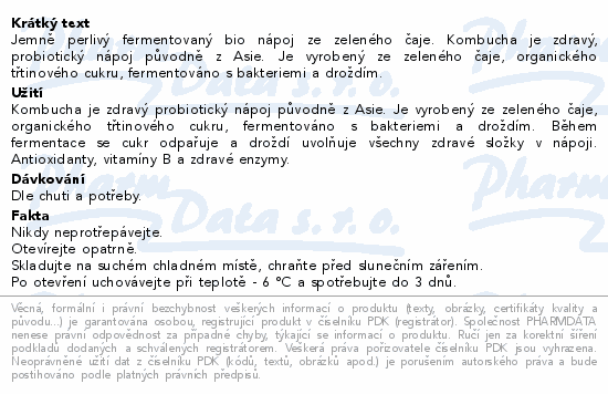 Jemně perlivý fermentovaný bio nápoj ze zeleného čaje. Kombucha je zdravý, probiotický nápoj původně z Asie. Je vyrobený ze zeleného čaje, organického třtinového cukru, fermentováno s bakteriemi a droždím.