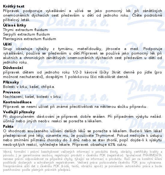 Přípravek podporuje vykašlávání a užívá se jako pomocný lék při zánětlivých onemocněních dýchacích cest především u dětí od jednoho roku. Čtěte pozorně příbalový leták.