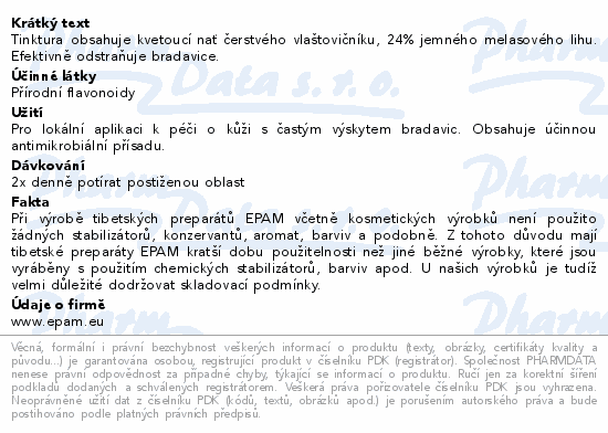 Tinktura obsahuje kvetoucí nať čerstvého vlaštovičníku, 24% jemného melasového lihu. Efektivně odstraňuje bradavice.
