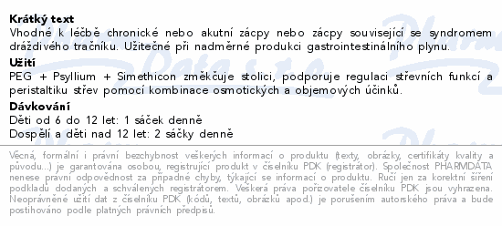 Vhodné k léčbě chronické nebo akutní zácpy nebo zácpy související se syndromem dráždivého tračníku. Užitečné při nadměrné produkci gastrointestinálního plynu.