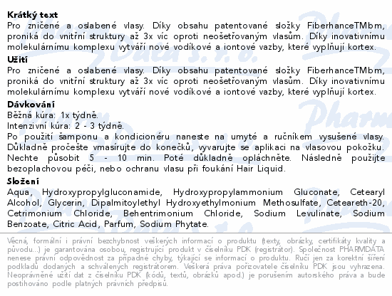 Pro zničené a oslabené vlasy. Díky obsahu patentované složky FiberhanceTMbm, proniká do vnitřní struktury až 3x víc oproti neošetřovaným vlasům. Díky inovativnímu molekulárnímu komplexu vytváří nové vodíkové a iontové vazby, které vyplňují kortex.
