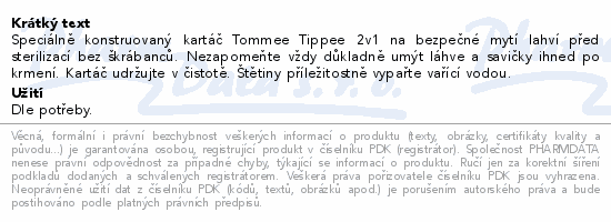 Speciálně konstruovaný kartáč Tommee Tippee 2v1 na bezpečné mytí lahví před sterilizací bez škrábanců. Nezapomeňte vždy důkladně umýt láhve a savičky ihned po krmení. Kartáč udržujte v čistotě. Štětiny příležitostně vypařte vařící vodou.