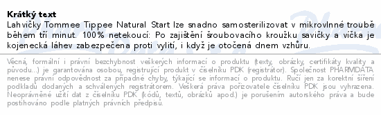 Lahvičky Tommee Tippee Natural Start lze snadno samosterilizovat v mikrovlnné troubě během tří minut. 100% netekoucí: Po zajištění šroubovacího kroužku savičky a víčka je kojenecká láhev zabezpečena proti vylití, i když je otočená dnem vzhůru.