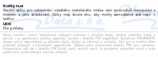 Sterilní sáčky pro uskladnění odsátého mateřského mléka vám zjednoduší manipulaci s mlékem a jeho skladování. Sáčky mají široké dno, aby mohly samostatně stát např. v lednici.