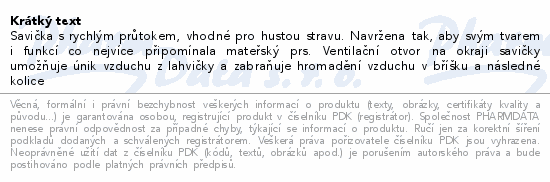 Savička s rychlým průtokem, vhodné pro hustou stravu. Navržena tak, aby svým tvarem i funkcí co nejvíce připomínala mateřský prs. Ventilační otvor na okraji savičky umožňuje únik vzduchu z lahvičky a zabraňuje hromadění vzduchu v bříšku a následné kolice