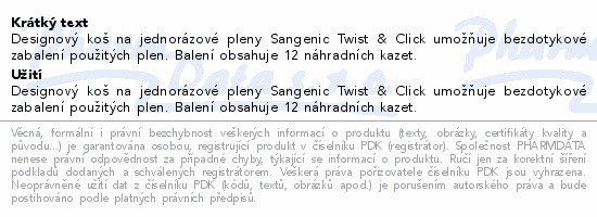 Designový koš na jednorázové pleny Sangenic Twist & Click umožňuje bezdotykové zabalení použitých plen. Balení obsahuje 12 náhradních kazet.