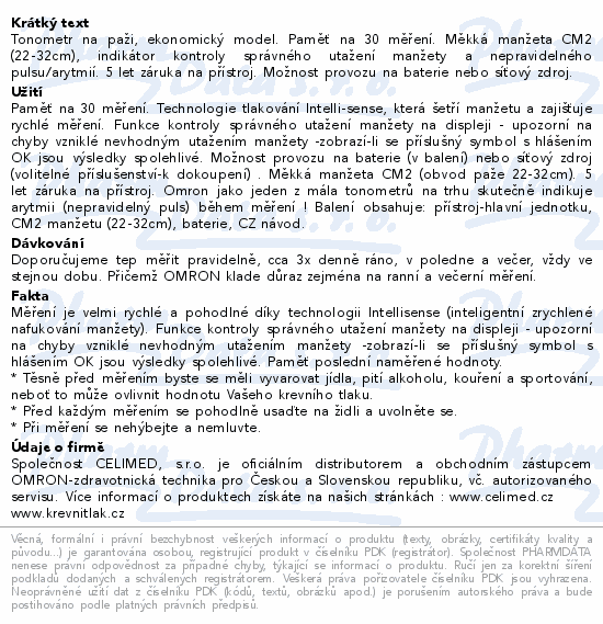 Tonometr na paži, ekonomický model. Paměť na 30 měření. Měkká manžeta CM2 (22-32cm), indikátor kontroly správného utažení manžety a nepravidelného pulsu/arytmií. 5 let záruka na přístroj. Možnost provozu na baterie nebo síťový zdroj.