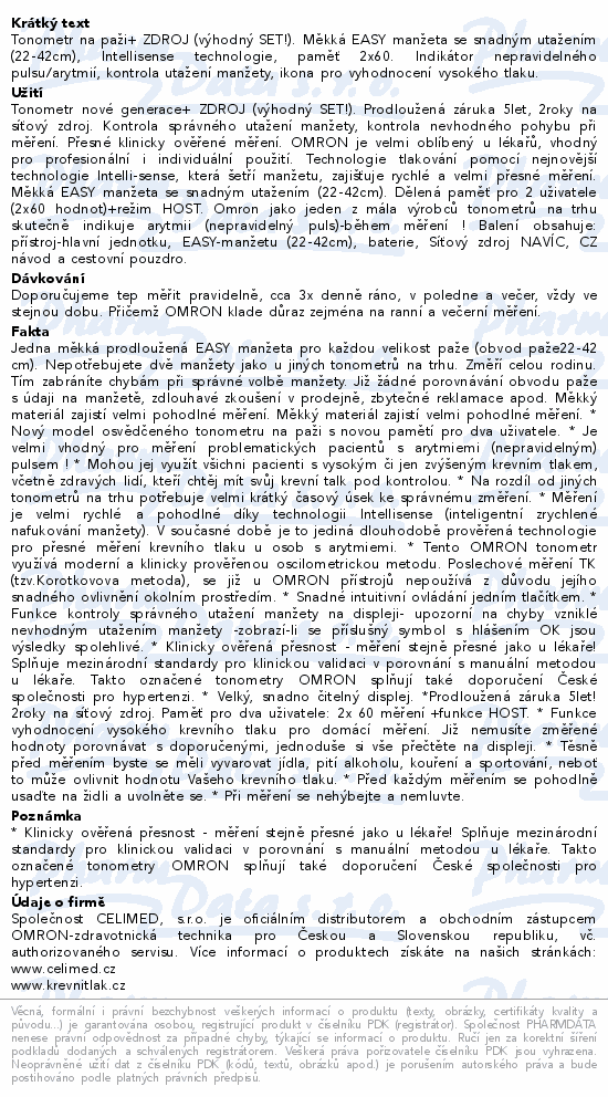 Tonometr na paži+ ZDROJ (výhodný SET!). Měkká EASY manžeta se snadným utažením (22-42cm), Intellisense technologie, paměť 2x60. Indikátor nepravidelného pulsu/arytmií, kontrola utažení manžety, ikona pro vyhodnocení vysokého tlaku.