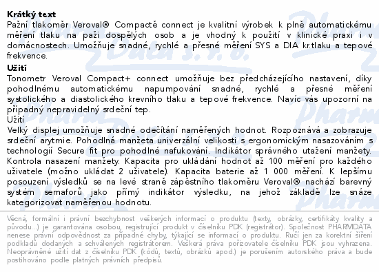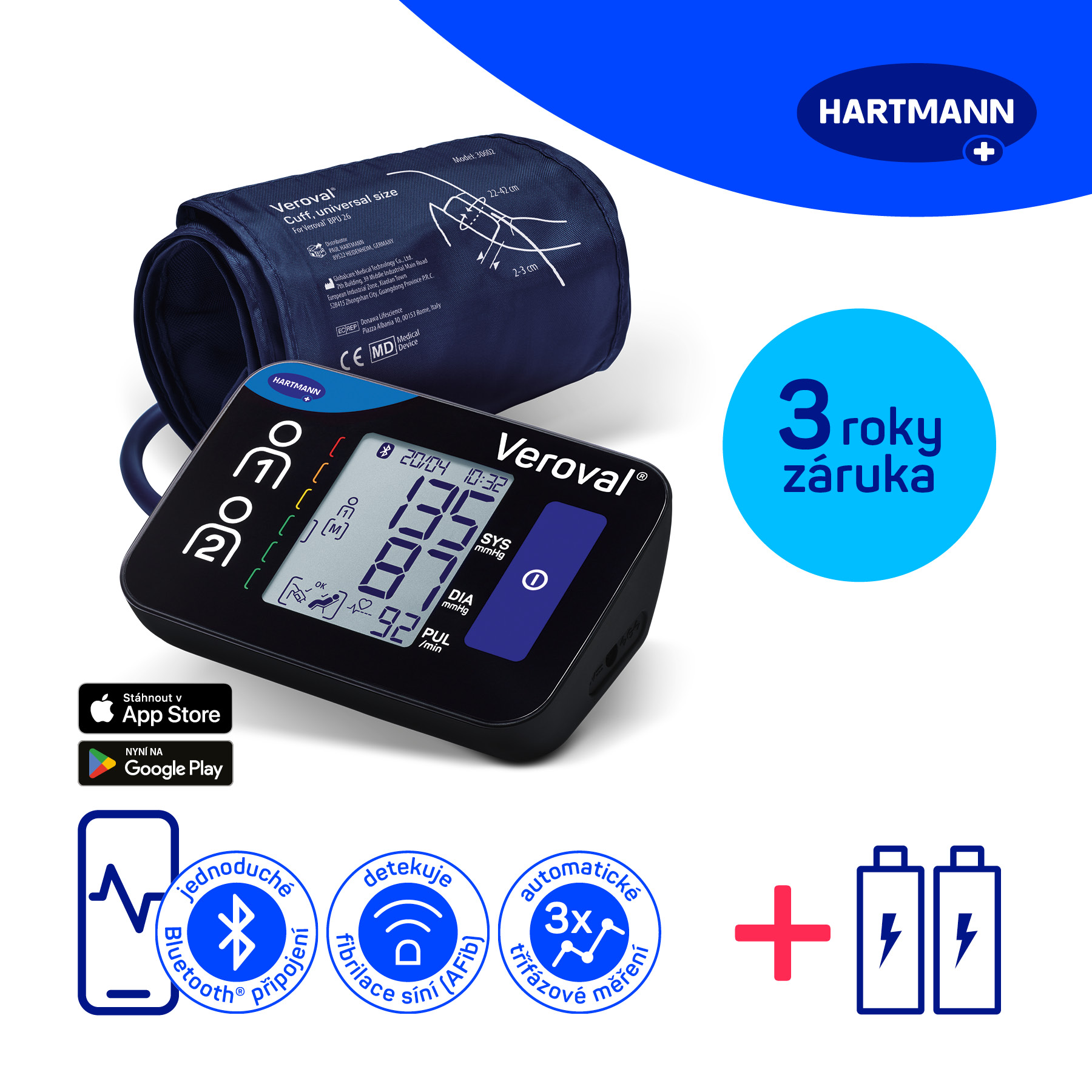 Tlakoměr HARTMANN Veroval® compact + connect na paži je moderním zařízením pro pravidelné měření tlaku v pohodlí domova. S pomocí vysoce přesné metody 3fázového měření zvládne, kromě krevního tlaku, spolehlivě detekovat také nepravidelný srdeční rytmus. Výsledky zjistíte ihned, a to na přehledném displeji nebo můžete využít aplikaci Veroval® medi.connect. Pokud vám nevyhovuje bateriový provoz, můžete samostatně dokoupit síťový adaptér.